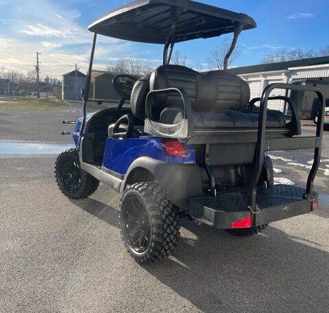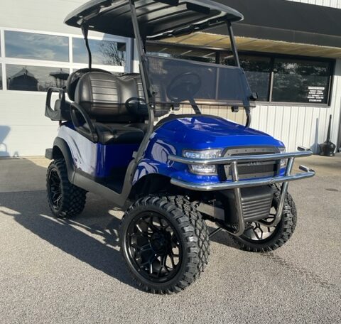 2018 CLUB CAR PRECEDENT, NEW ALPHA BODY IN BLUE, LIFTED, GAS, NEW TINTED WINDSHIELD, PREMIUM FRONT AND REAR SEATS, FOLD DOWN BACK SEAT WITH STORAGE COMPARTMENT, NEW TRIM, NEW TOP, HEADLIGHT/TAILLIGHTS